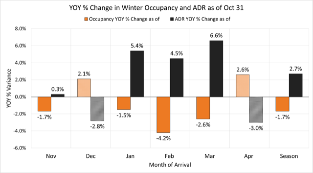 While rates stabilize, price sensitivity remains. There’s an inverse relationship between occupancy and room rates (black bars). Where year-over-year rates are up, occupancy is down (orange bars), and vice-versa (black & orange hash). Rate sensitivity that was apparent during the summer season is now extending into winter and is expected to continue as travel competes for consumers' discretionary dollars.