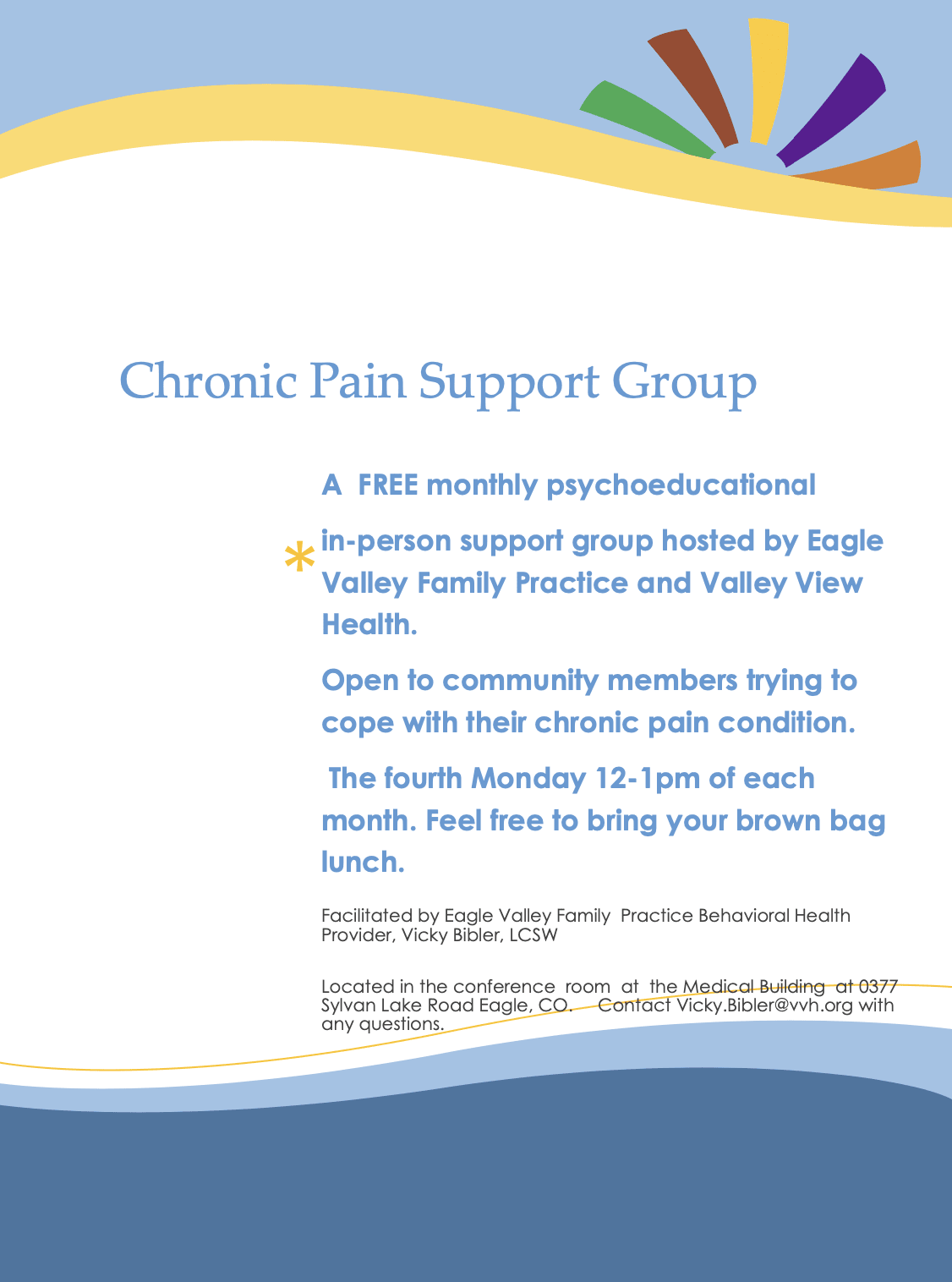 Valley View is pleased to announce the upcoming dates of its free, ongoing “Chronic Pain” support series at Eagle Valley Family Practice, part of Valley View. The Chronic Pain Support Group, presented by Behavioral Health Professional Vicky Bibler, is a free, monthly psychoeducational support group that takes place in person on the fourth Monday of each month from 12 to 1 p.m. MST. The event is open to community members who are trying to cope with their chronic pain condition. Individuals are encouraged to bring a brown bag lunch.