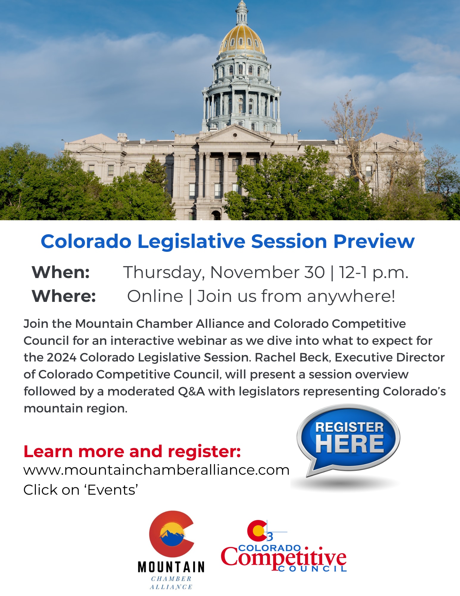 Join the Mountain Chamber Alliance and Colorado Competitive Council for an interactive webinar as we dive into what to expect for the 2024 Colorado Legislative Session. Rachel Beck, Executive Director of Colorado Competitive Council, will present a session overview followed by moderated Q&A with legislators representing Colorado's mountain region.