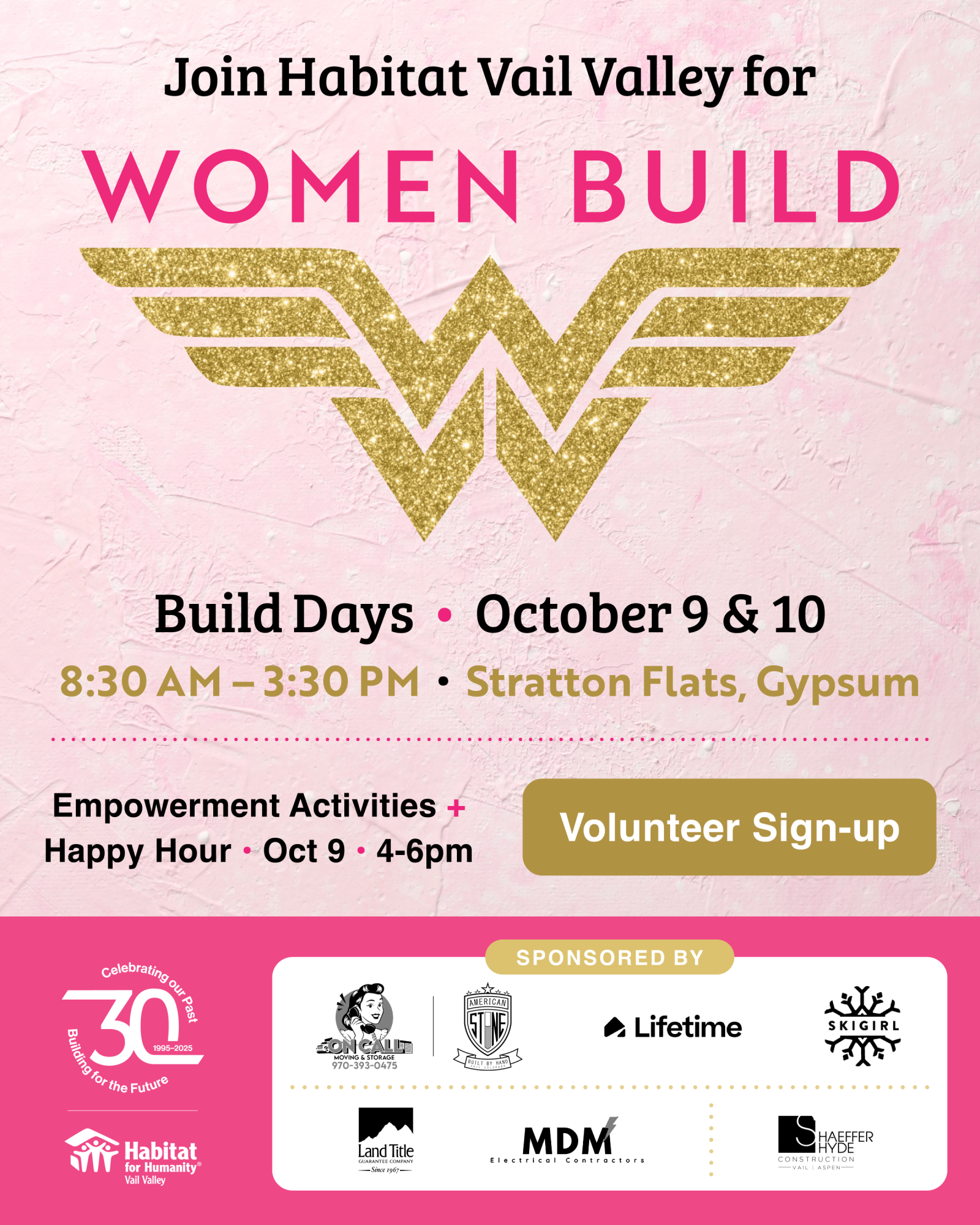 Join us for an unforgettable day of impact and empowerment at Habitat Vail Valley’s Women’s Build Day! Work alongside other amazing women to help create affordable housing for hardworking local families — and walk away with more than just memories.