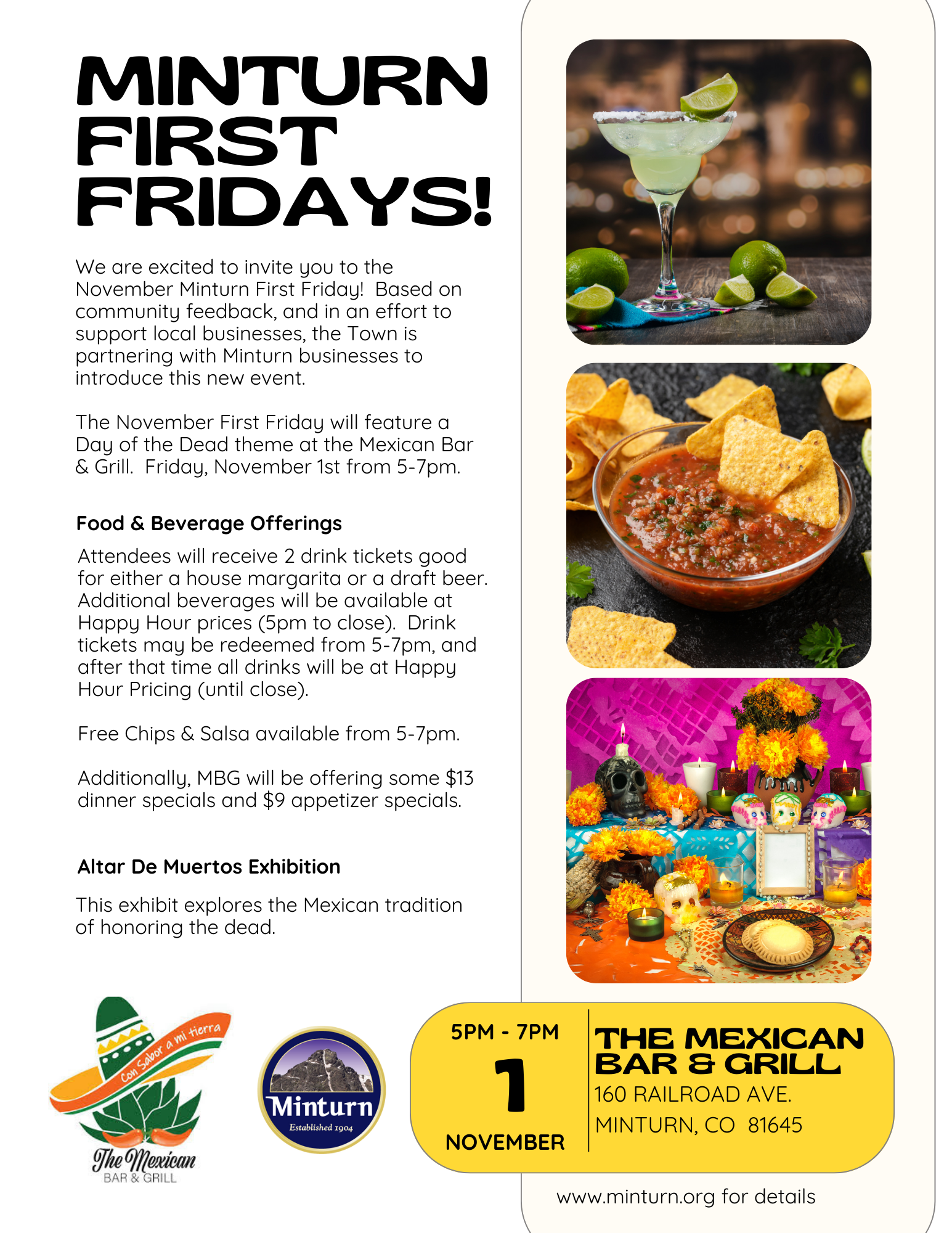 The November First Friday will feature a Day of the Dead theme at the Mexican Bar & Grill. Friday, November 1st from 5-7pm. Attendees will receive 2 drink tickets good for either a house margarita or a draft beer. Additional beverages will be available at Happy Hour prices (5pm to close). Drink tickets may be redeemed from 5-7pm., and after that time all drinks will be at Happy Hour pricing. Free Chips & Salsa available from 5-7pm. Additionally, MBG will be offering some $13 dinner specials and $9 appetizer specials. Altar De Muertos Exhibition: This exhibit explores the Mexican tradition of honoring the dead. This event is sponsored by the Town of Minturn.