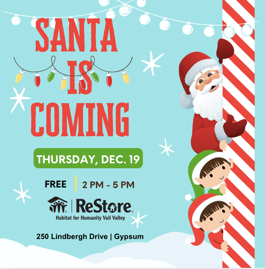 Start winter break off right with a free visit with Santa at the Habitat ReStore in Gypsum. Santa will be on site from 2 p.m. to 5 p.m. Bring your camera to capture the magic.