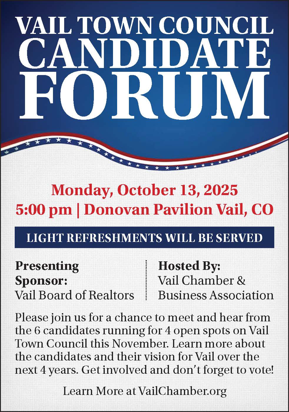 Please join us for a chance to meet and hear from the 6 candidates running for 4 open spots on Vail Town Council this November. Learn more about the candidates and their vision for Vail over the next 4 years. Get involved and don’t forget to vote! LearnMore at VailChamber.org