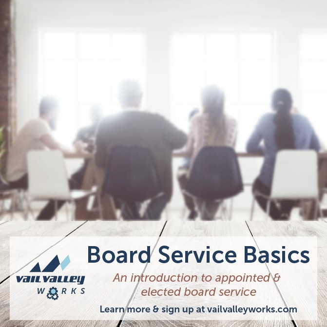 Are you looking for ways to serve the local community? Does board service sound appealing, but a little intimidating too? Are you new to a board of directors and aren’t quite sure what role you play? Join us for Board Service Basics – an introduction to appointed & elected board service. This course is designed to give you the knowledge and framework to effectively serve on a wide range of local boards – from non-profits to special districts and everything in between! No experience required.